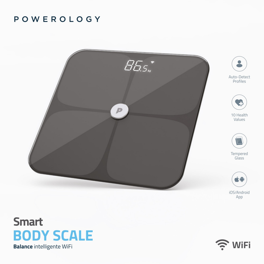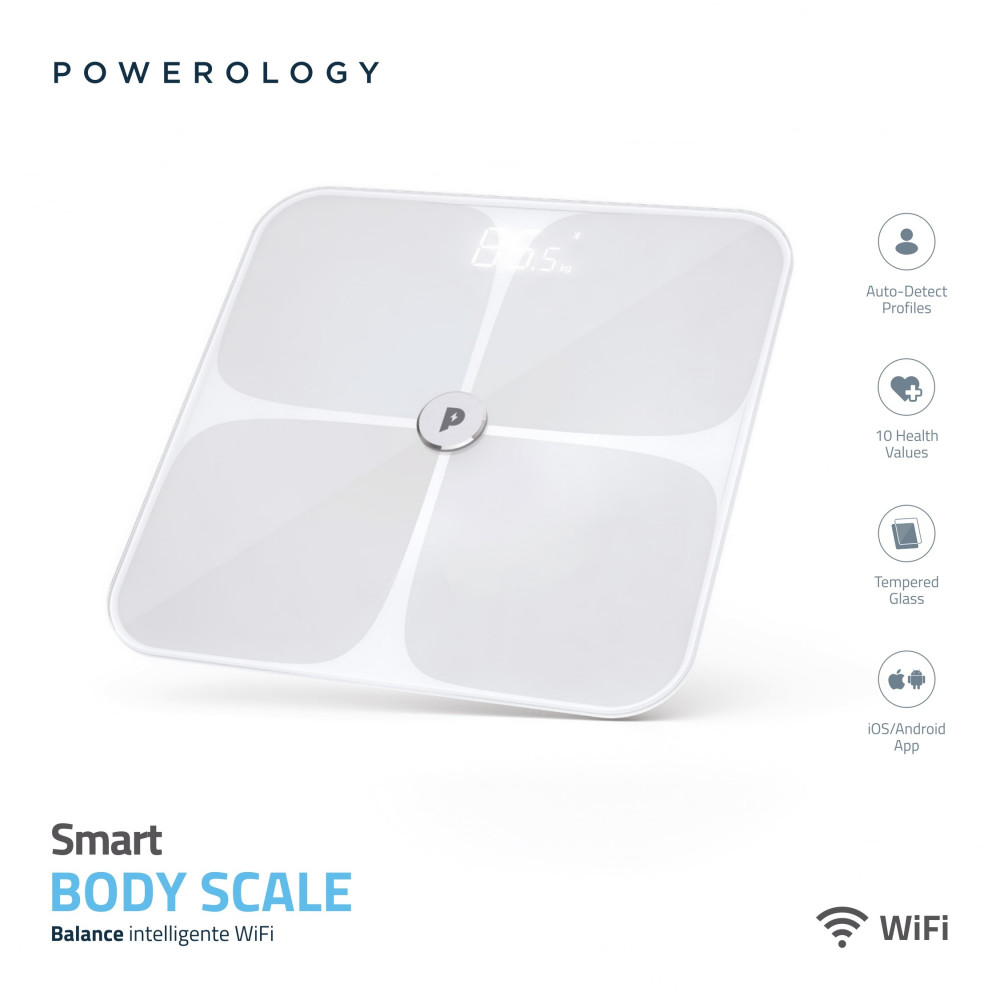 مقياس الجسم الذكي Powerology WiFi عبارة عن أداة ذكية للحفاظ على لياقتك. ابق على علم بأي تغييرات في جسمك ودع هذا الميزان يتتبع صحتك من أجلك. ما يصل إلى 10 قيم في القياس تُعلمك بأي شيء تقريبًا. سيعرف ملف تعريف الكشف التلقائي من أنت بمجرد أن تقف على هذا المقياس. امنح حياة صحية لعائلتك وأحبائك من خلال إنشاء ملف تعريف لكل منهم. الزجاج المقسى هو حقيقة متانته.